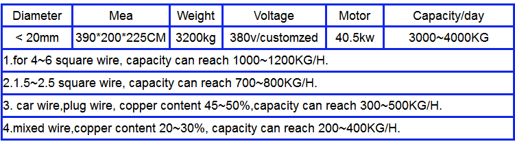 The copper cable granulator machine can separate the range of scrap wires,its capacity is up to 3000~4000 kg/day,its copper recovery rate is up to 99.98%.and no environmental pollution,low noise and it’s very high performance .